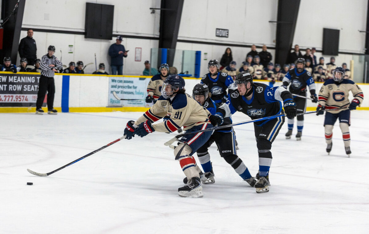 Ermolai Yarygin (#91) corrals the puck in Cloverdale HC’s 5-2 win over the Abbotsford Pilots Feb.22 at The Barn. The win gave Cloverdale a stranglehold in the series, putting the expansion club up on the Pilots 3 games to 1. Yarygin, who hails from Delta, is averaging 1.25 points per game in the playoffs, netting 1 goal and adding 4 assists so far in the series. | Photo: Jason Sveinson